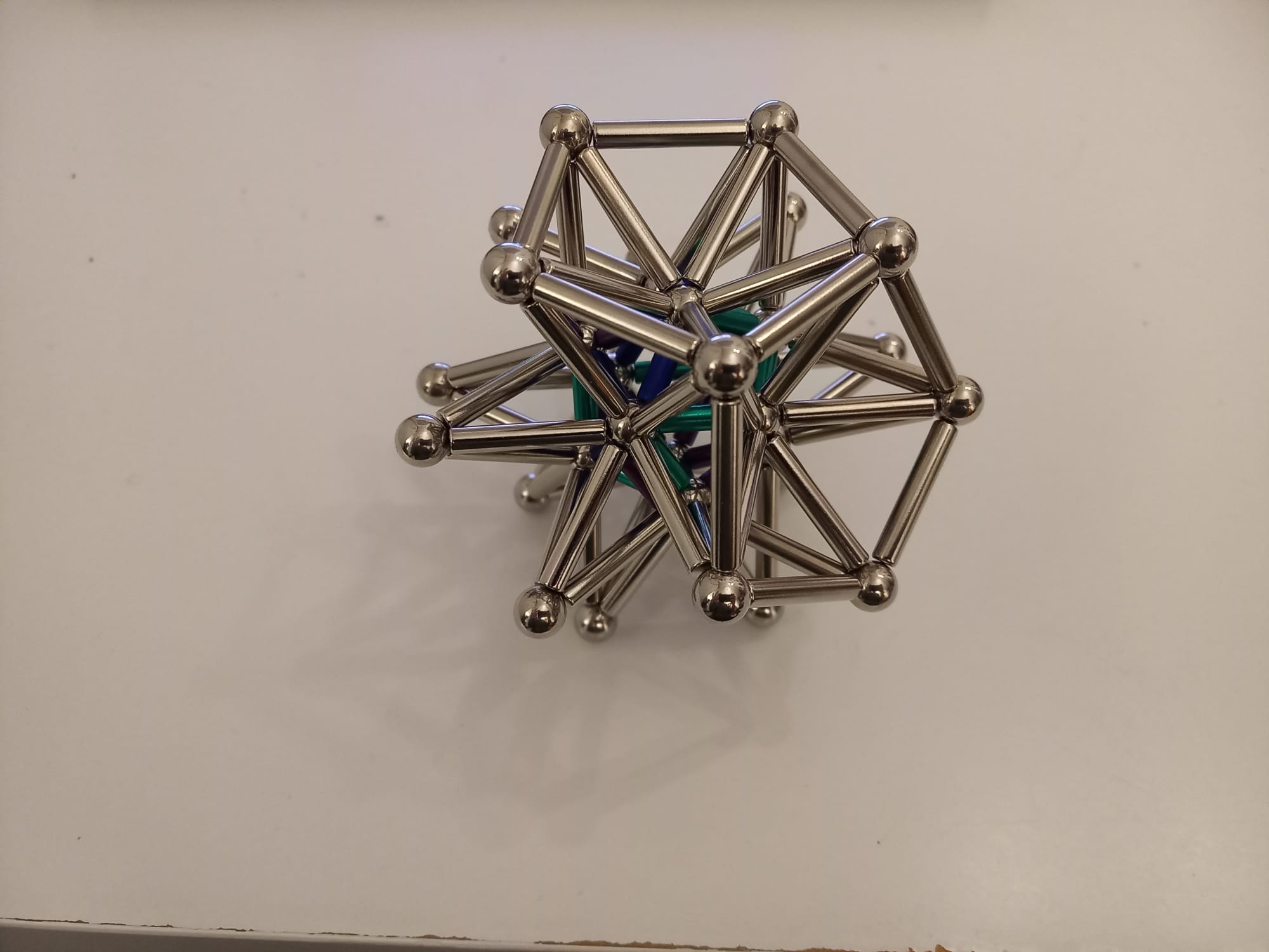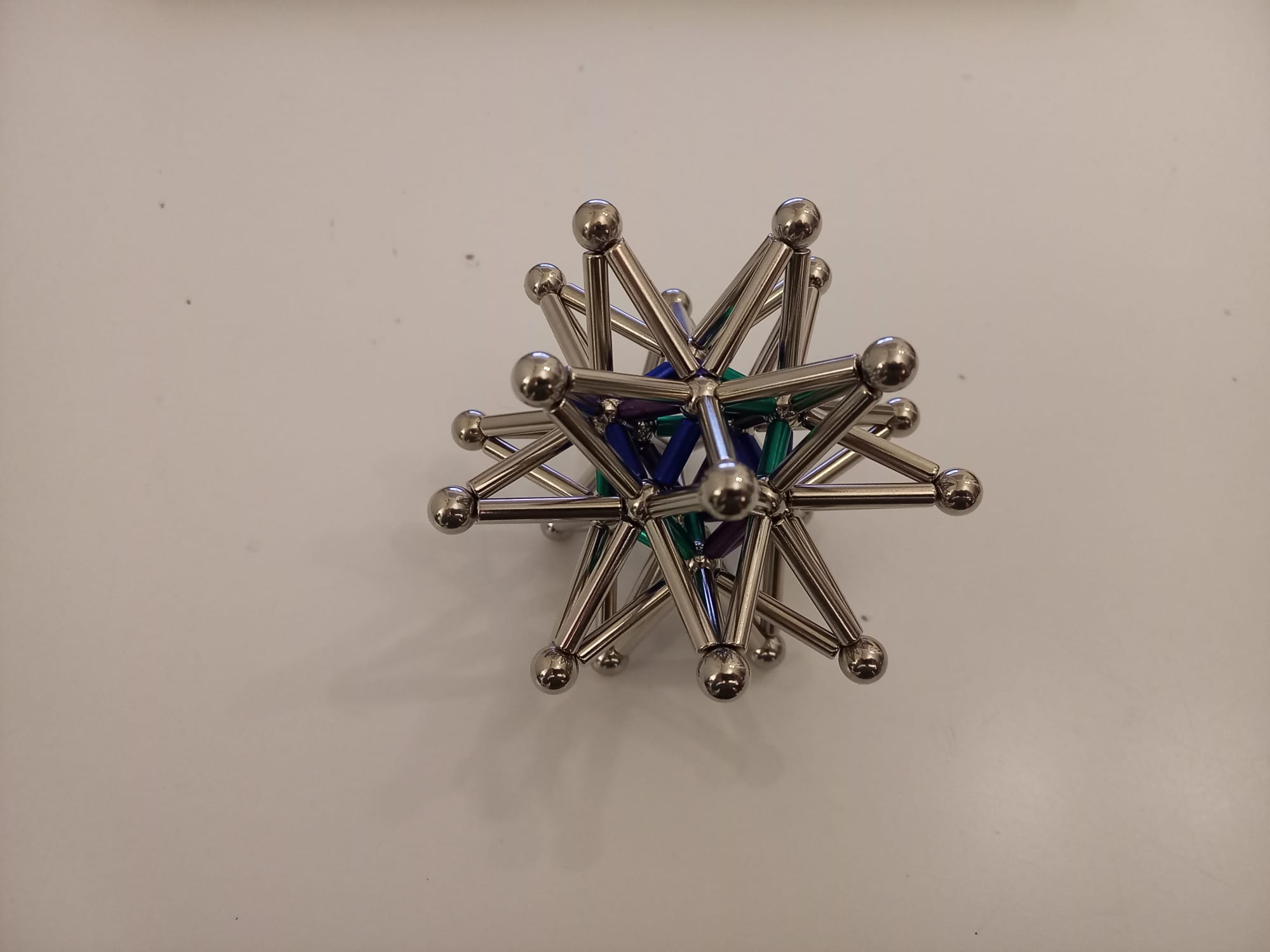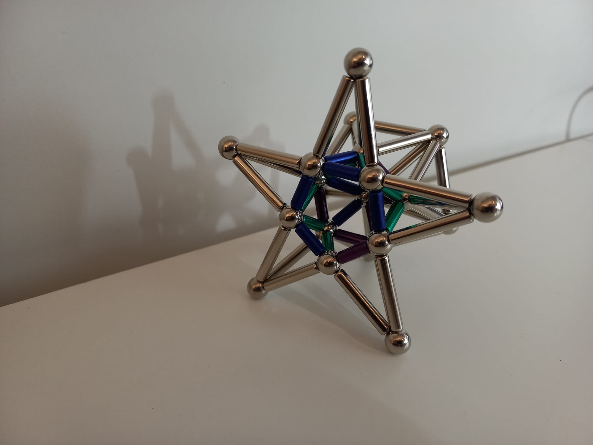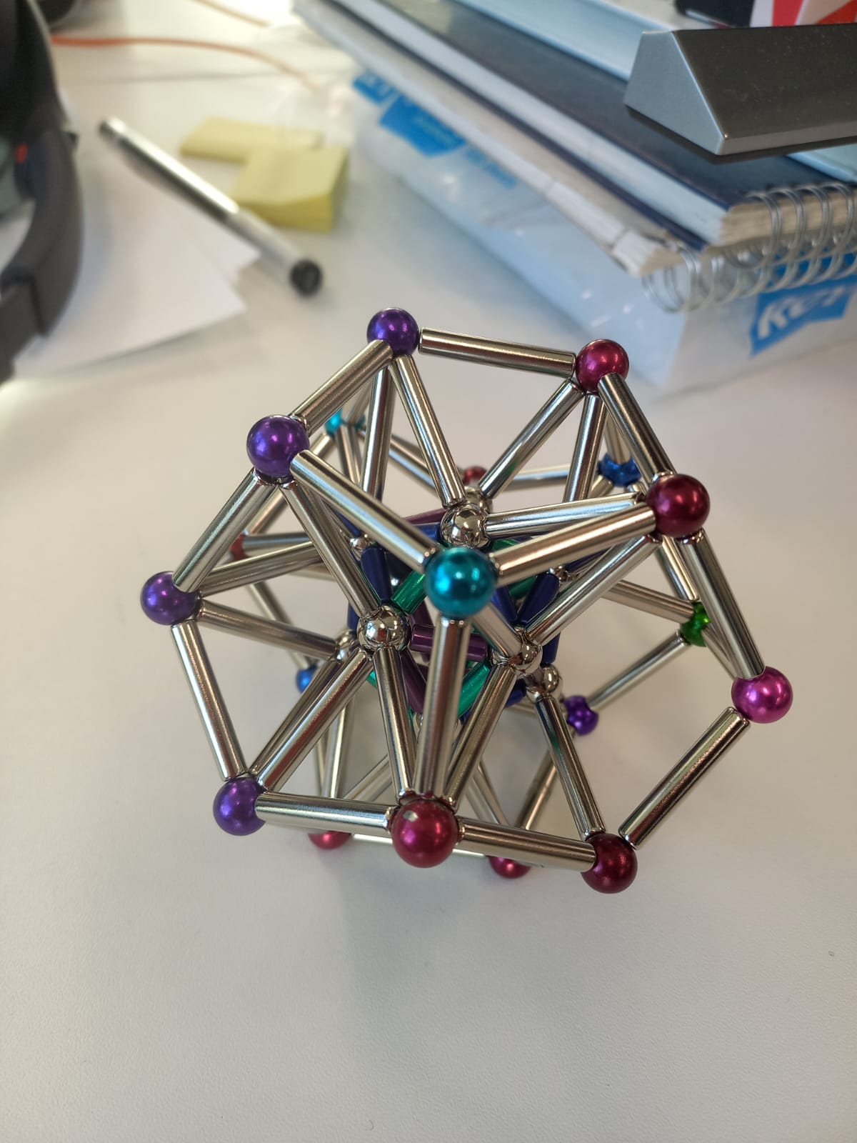 I am a huge enthusiast for — to avoid using any brand names here — `magnetic sticks and balls'. I always liked these while I was growing up. Then, when I was studying Topology in 2nd year maths, I saw Simplicial Complexes for the first time and I was instantly reminded of the toy. So I bought myself a small set for my desk. And a matching set for my sister (a fellow topology enthusiast). Then I wasn't satisfied with making only half a stellated icosahedron, so I extended the collection further...