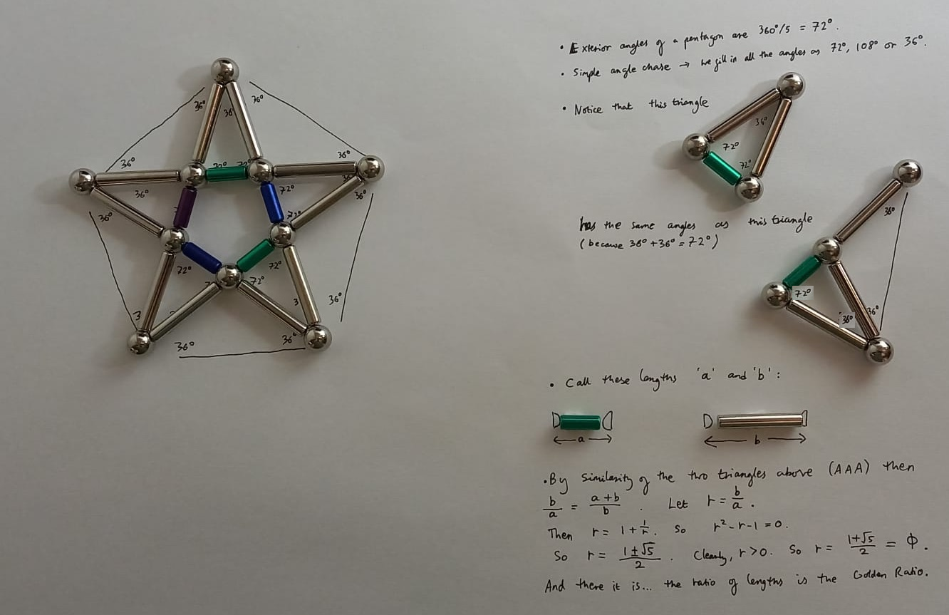 After one very distracted day when I kept playing with this on my desk instead of doing my actual research, I realised that this construction of a dodecahedron from a stellated icosahedron is only possible because certain sets of edges form pentagrams (that are flat/ lie in a plane). And this is only possible because the ratio between the lengths of the two brands of `stick' is more or less exactly* the Golden Ratio, \(\phi = \frac{1+ \sqrt{5}}{2}\)!**